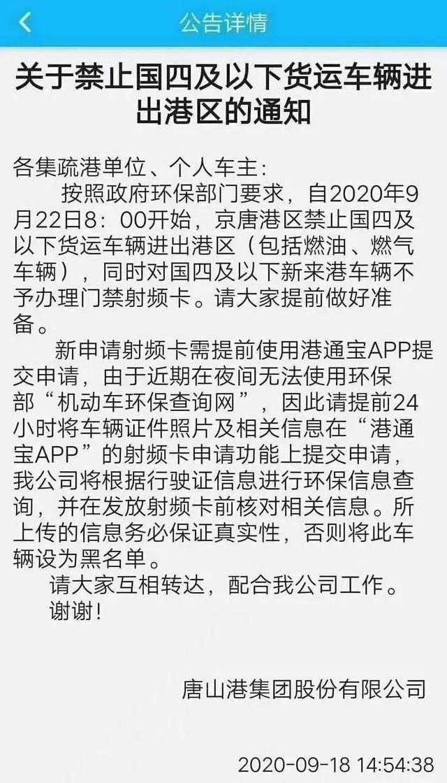 河北唐山港發(fā)布通知,9月22日上午八點開始,京唐港區(qū)將禁止國四及以下貨運車輛進(jìn)出港區(qū),包括燃油、燃?xì)廛囕v,同時不再給國四及以下新來港車輛辦理門禁射頻卡。