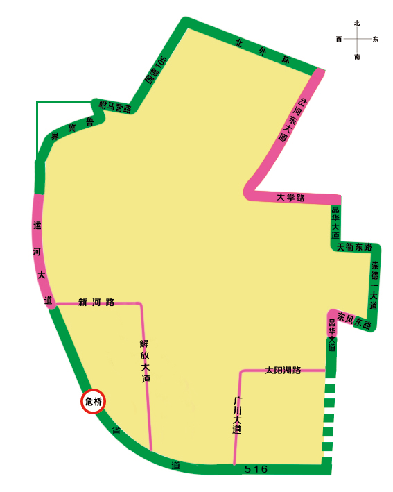 ? 駙馬營路—G105—北外環(huán)—岔河?xùn)|大道—大學(xué)東路—晶華大道(北段)—天衢東路—崇德一大道—東風(fēng)東路—晶華大道(南段)—S516—運河大道—魯冀界以內(nèi)。